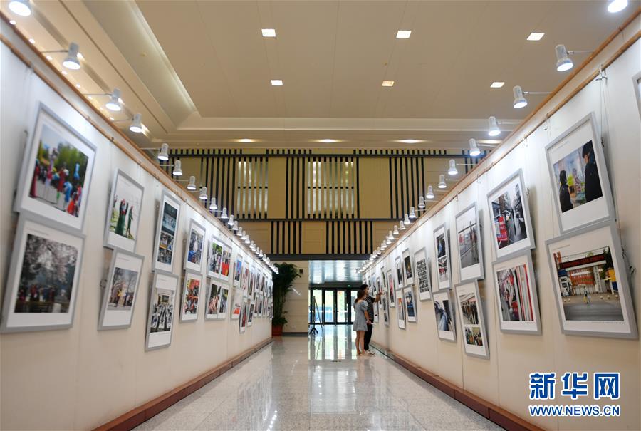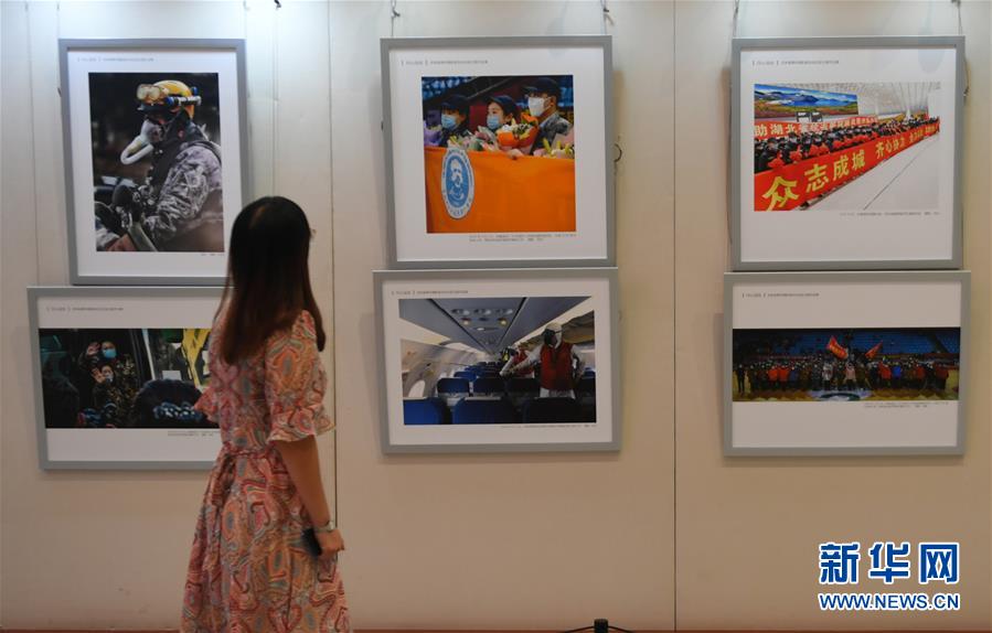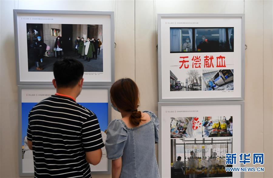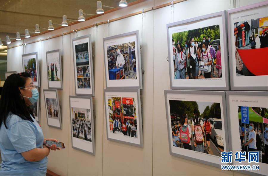 8月8日,观众在作品展上参观。 当日,吉林省抗疫主题青年音乐书法摄影作品展在省图书馆举行,展览共展出150余件书法作品、80余幅摄影作品和8首原创音乐。 新华社记者 林宏 摄