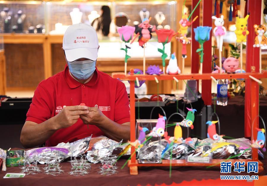 8月8日,在第十八届中关村国际美食节美食美酒嘉年华文创非遗展示区,工作人员制作面塑。新华社记者 任超 摄
