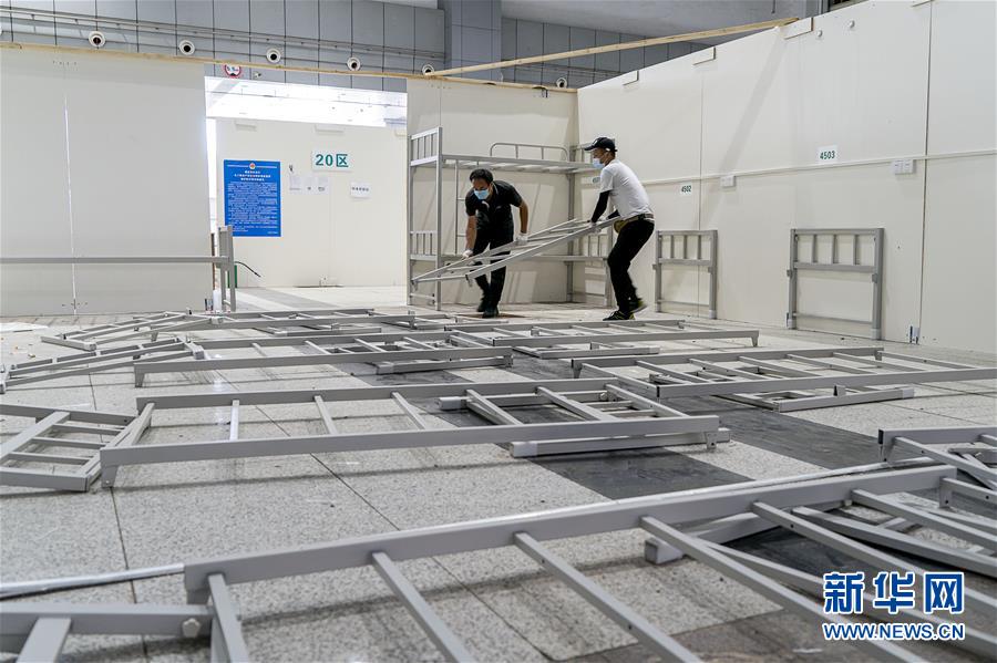 8月13日,工作人员在江汉方舱内进行拆除作业。 当日,为应对新冠肺炎疫情设立的武汉江汉方舱医院正式开始关舱拆除作业。 据介绍,江汉方舱医院是由武汉国际会展中心改建而成,2月5日开始收治第一批患者。截至3月9日休舱,江汉方舱医院共收治患者1848人,累计治愈出院1327人、转出521人。 新华社记者 熊琦 摄