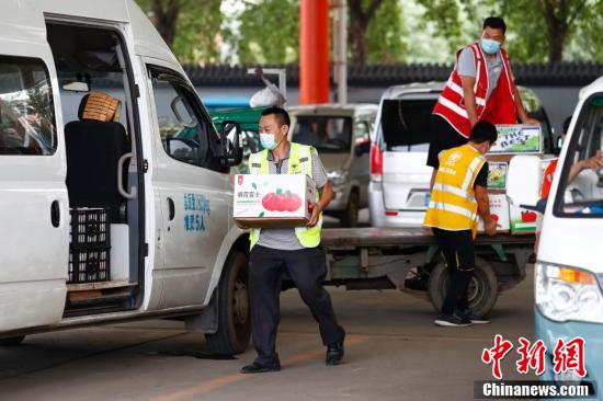 6月11日,北京发生新发地批发市场聚集性疫情。市场于6月13日凌晨3时起紧急休市。经过一个多月的战“疫”,北京有效控制了此次疫情。经历了全面消杀、升级改造后的新发地批发市场,全面取消零售功能,分期复市。记者近日走进新发地批发市场试运营的周转新区进行探访。这里于7月31日试运营,主要供应苹果、梨、姜、蒜。 升级改造后的新发地批发市场严格执行“批零分离、干湿分离、生熟分离”,采取“卖方注册制,买方会员制”的措施,供货商(卖家)和采购商(买家)均需按照“注册—预约—进场—交易—离场”五个环节完成交易活动。交易按规矩进行,一切都“在线”。图为8月6日,供货商在新发地批发市场周转新区搬运物品。中新社记者 富田 摄