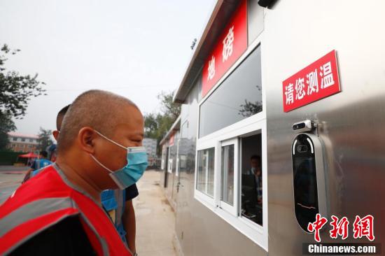 6月11日,北京发生新发地批发市场聚集性疫情。市场于6月13日凌晨3时起紧急休市。经过一个多月的战“疫”,北京有效控制了此次疫情。经历了全面消杀、升级改造后的新发地批发市场,全面取消零售功能,分期复市。记者近日走进新发地批发市场试运营的周转新区进行探访。这里于7月31日试运营,主要供应苹果、梨、姜、蒜。 升级改造后的新发地批发市场严格执行“批零分离、干湿分离、生熟分离”,采取“卖方注册制,买方会员制”的措施,供货商(卖家)和采购商(买家)均需按照“注册—预约—进场—交易—离场”五个环节完成交易活动。交易按规矩进行,一切都“在线”。图为8月6日,供货商在新发地批发市场周转新区入场时测温。中新社记者 富田 摄