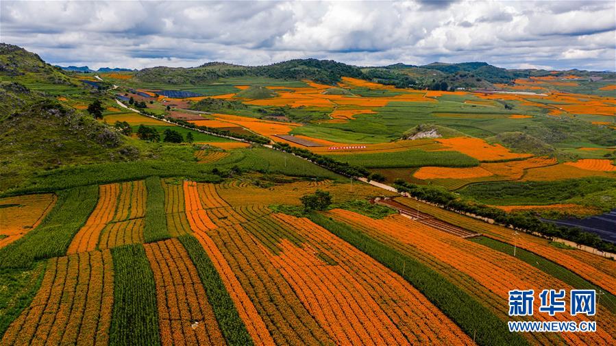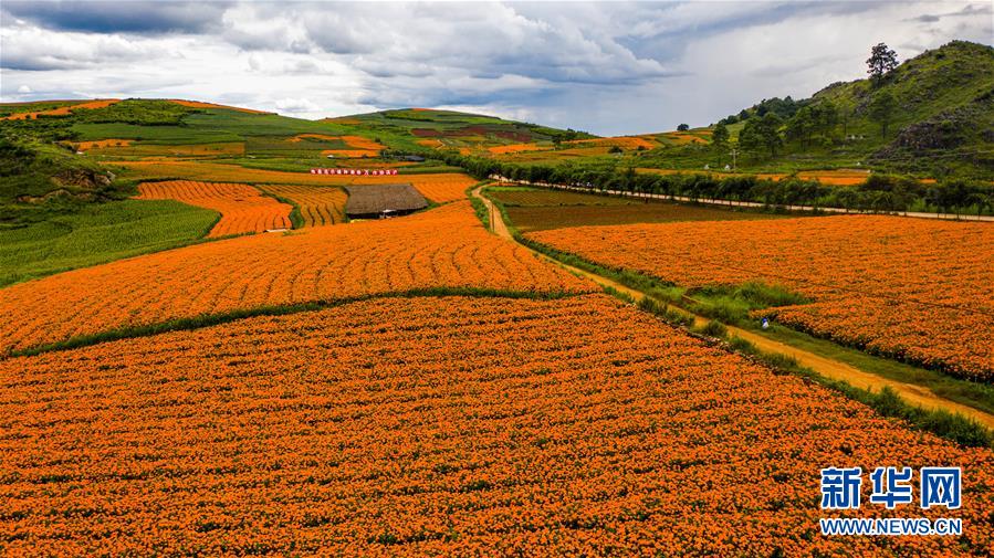 这是8月13日在云南省丘北县拍摄的万寿菊花海一景(无人机照片)。 近年来,为加快特色产业发展,促进农民增收,云南省丘北县以“公司+基地+农户”的模式大力发展万寿菊产业。据了解,2020年丘北县种植万寿菊达10.3万亩,受益农户约1.3万户,户均增收约1.2万元。万寿菊成为带动乡村经济发展、巩固脱贫成果的“致富花”。 新华社记者 胡超 摄