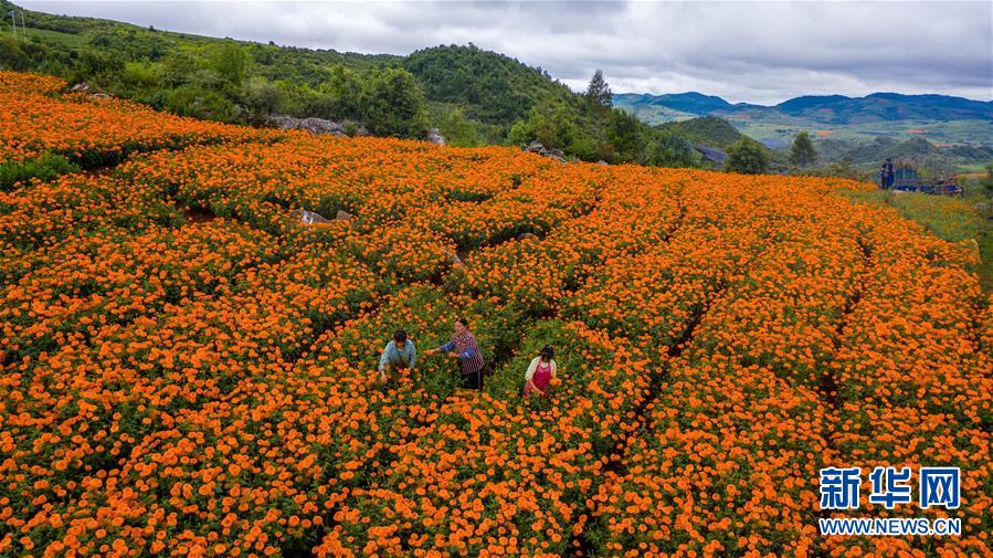 农民在花田里采摘万寿菊(8月13日摄,无人机照片)。 近年来,为加快特色产业发展,促进农民增收,云南省丘北县以“公司+基地+农户”的模式大力发展万寿菊产业。据了解,2020年丘北县种植万寿菊达10.3万亩,受益农户约1.3万户,户均增收约1.2万元。万寿菊成为带动乡村经济发展、巩固脱贫成果的“致富花”。 新华社记者 胡超 摄