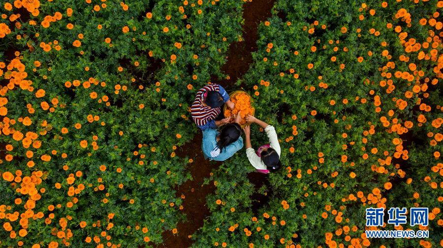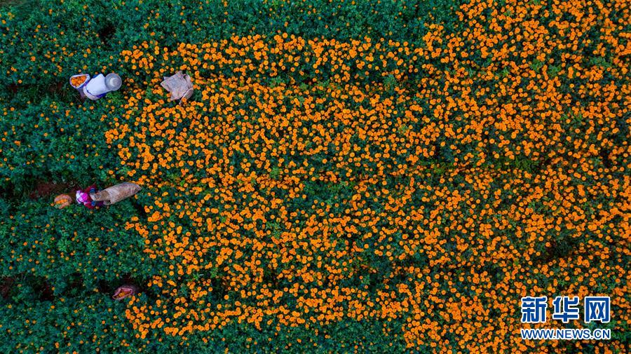 农民在花田里将万寿菊装袋(8月13日摄,无人机照片)。 近年来,为加快特色产业发展,促进农民增收,云南省丘北县以“公司+基地+农户”的模式大力发展万寿菊产业。据了解,2020年丘北县种植万寿菊达10.3万亩,受益农户约1.3万户,户均增收约1.2万元。万寿菊成为带动乡村经济发展、巩固脱贫成果的“致富花”。 新华社记者 胡超 摄