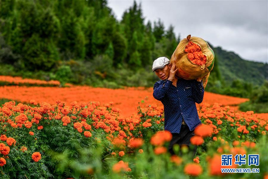 农民在花田里搬运万寿菊(8月13日摄)。 近年来,为加快特色产业发展,促进农民增收,云南省丘北县以“公司+基地+农户”的模式大力发展万寿菊产业。据了解,2020年丘北县种植万寿菊达10.3万亩,受益农户约1.3万户,户均增收约1.2万元。万寿菊成为带动乡村经济发展、巩固脱贫成果的“致富花”。 新华社记者 胡超 摄