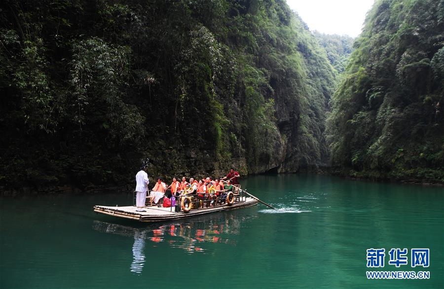 游客在阿依河景区乘坐竹筏游览(8月13日摄)。 阿依河景区地处重庆市彭水苗族土家族自治县,融山、水、林、泉、峡于一体,集雄、奇、险、秀、幽于一身。近年来,阿依河景区利用良好的自然条件和丰富的民俗文化,不断丰富旅游项目、改善旅游体验、拓展旅游业态,发展“美丽经济”。 新华社记者 王全超 摄