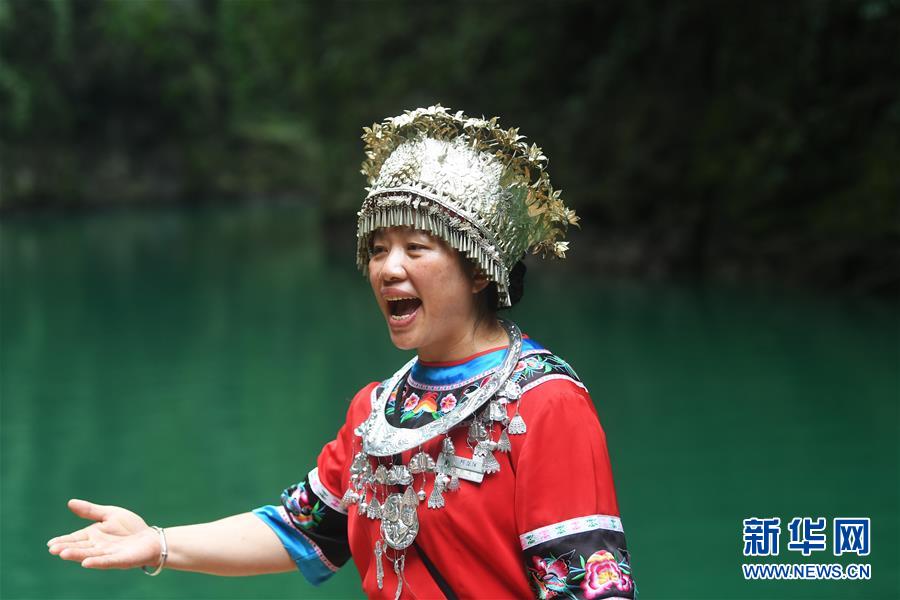 阿依河景区工作人员在为乘坐竹筏游览的游客演唱山歌(8月13日摄)。 阿依河景区地处重庆市彭水苗族土家族自治县,融山、水、林、泉、峡于一体,集雄、奇、险、秀、幽于一身。近年来,阿依河景区利用良好的自然条件和丰富的民俗文化,不断丰富旅游项目、改善旅游体验、拓展旅游业态,发展“美丽经济”。 新华社记者 王全超 摄