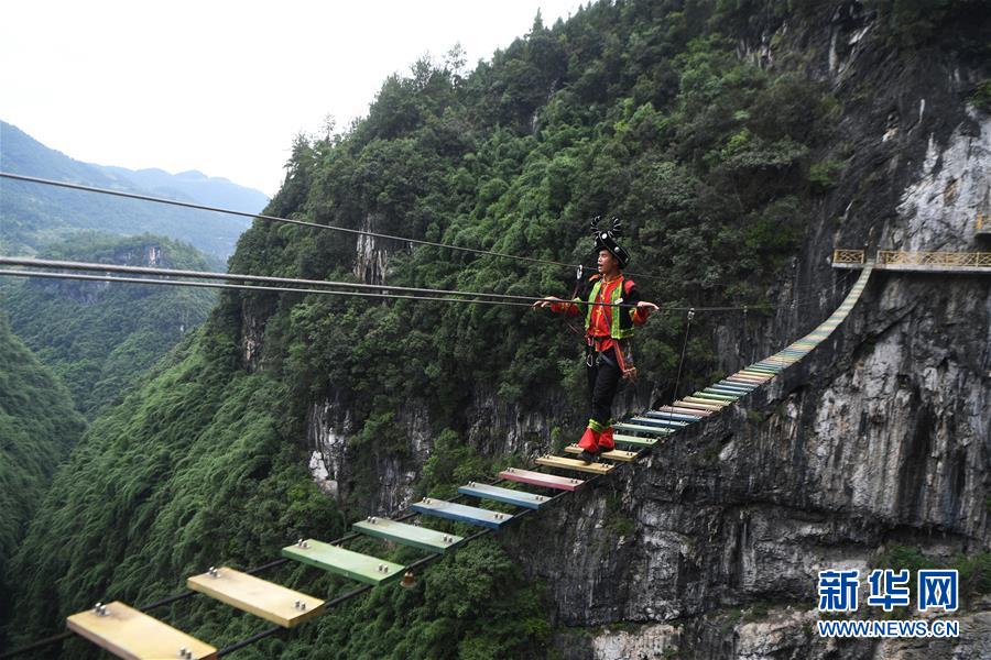 阿依河景区工作人员在“天梯”上演唱山歌(8月13日摄)。 阿依河景区地处重庆市彭水苗族土家族自治县,融山、水、林、泉、峡于一体,集雄、奇、险、秀、幽于一身。近年来,阿依河景区利用良好的自然条件和丰富的民俗文化,不断丰富旅游项目、改善旅游体验、拓展旅游业态,发展“美丽经济”。 新华社记者 王全超 摄