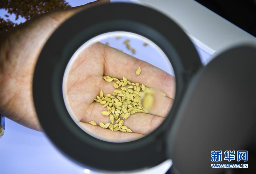 在吉林市永吉县一拉溪镇九月丰家庭农场,工作人员在实验室中检测一批试种水稻的稻谷外观(8月12日摄)。 新华社记者 许畅 摄