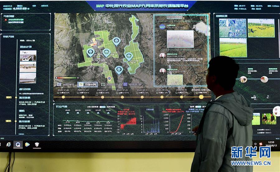 在吉林市永吉县一拉溪镇九月丰家庭农场,工作人员通过卫星影像数据观察作物长势(8月12日摄)。 新华社记者 许畅 摄
