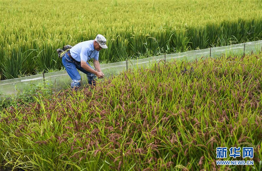 在吉林市孤店子镇春新农场,农民对试种的彩色稻米进行田间管护(8月13日摄)。 新华社记者 许畅 摄