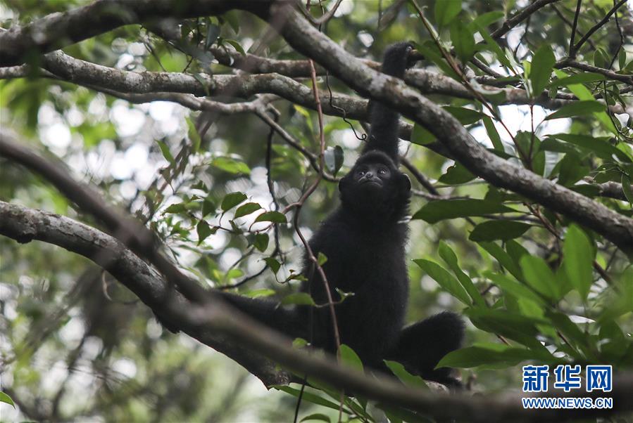 这是2019年10月25日在海南白沙县热带雨林里拍摄的一只海南长臂猿。新华社记者 蒲晓旭 摄