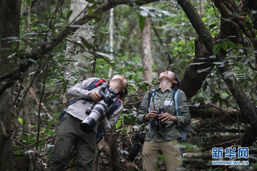调查人员在海南白沙县的热带雨林中观测、拍摄海南长臂猿(2019年10月25日摄)。新华社记者 蒲晓旭 摄