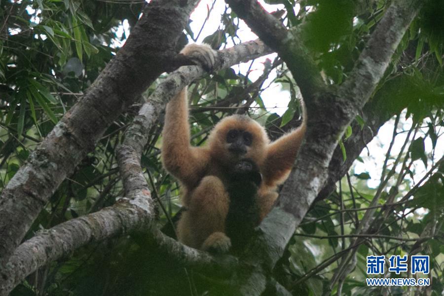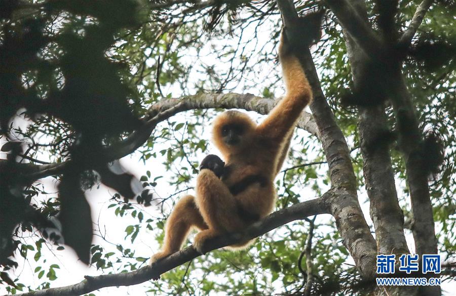 这是在海南白沙县的热带雨林里拍摄的一只带着幼崽的雌性海南长臂猿(2019年10月25日摄)。新华社记者 蒲晓旭 摄