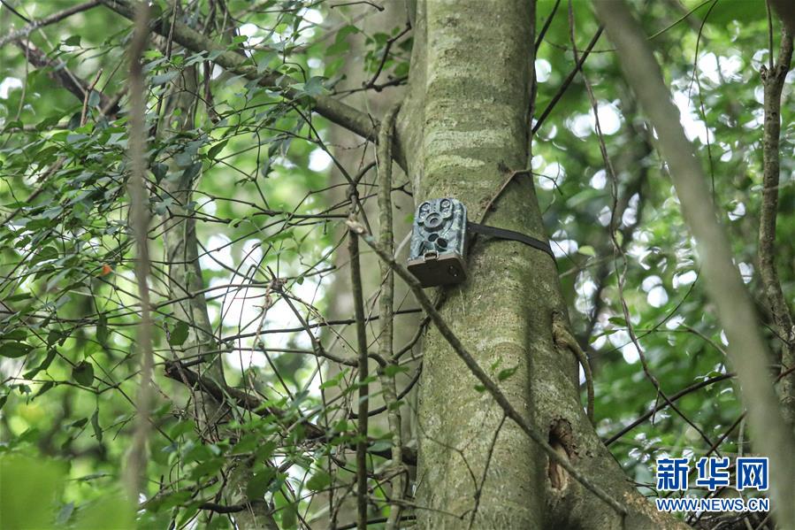 在海南白沙县的热带雨林中,一台被安装在树上用于拍摄海南长臂猿的红外相机(2019年10月25日拍摄)。新华社记者 蒲晓旭 摄