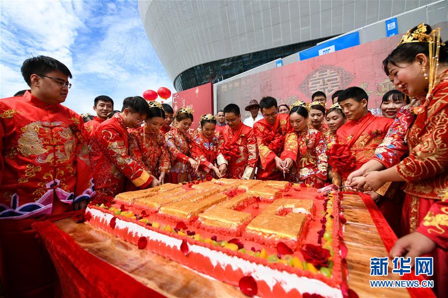 8月24日,在成都高新区体育中心项目建设现场,新人们一起切蛋糕。 当日,一场以“建证幸福、喜迎大运”为主题的中式传统集体婚礼在成都高新区体育中心项目建设现场举行,22对中建四局西南分局一线建设者喜结良缘。据悉,由于众多建设者常年忙碌在施工一线,不少领取结婚证的夫妇没有时间举办婚礼。在七夕节来临之际,中建四局西南分局特意为他们举办集体婚礼。 新华社记者 王曦 摄