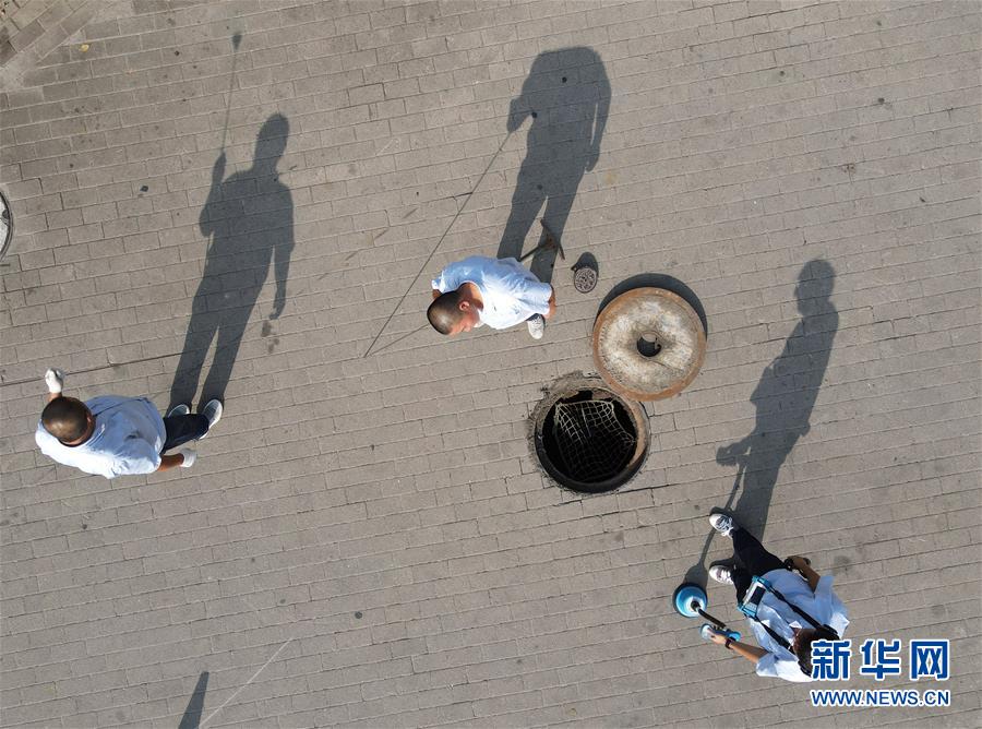 8月25日,在合肥市蜀山区,听漏队队员宋立军(左)、吕军(中)和张杨对供水管道进行巡检(无人机照片)。 新华社记者 周牧 摄