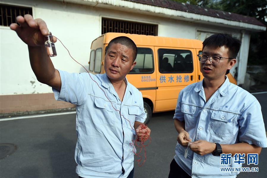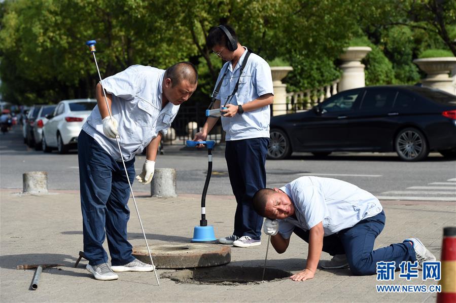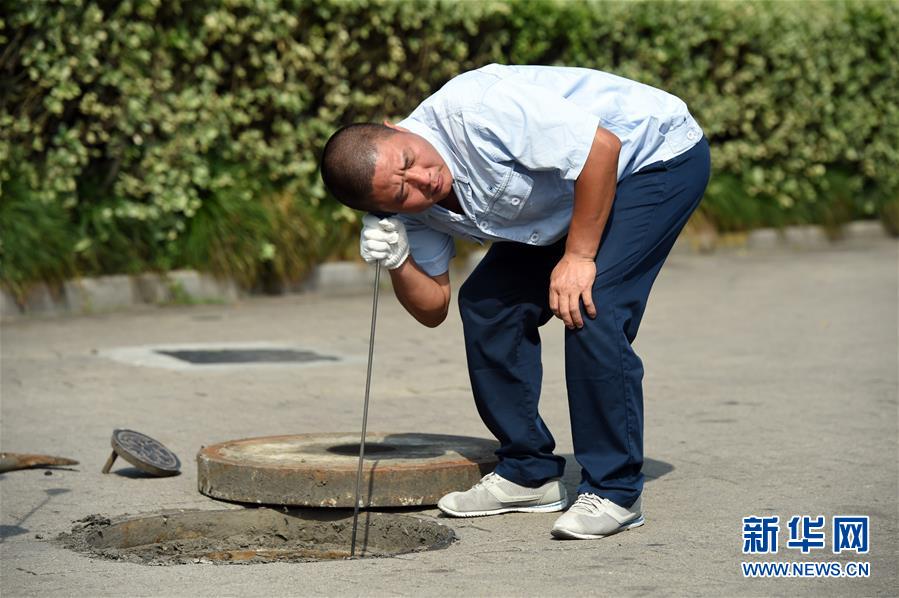 8月25日,在合肥市蜀山区邮电新村小区,听漏队队员吕军用听漏棒对供水管道进行漏水检测。 新华社记者 周牧 摄