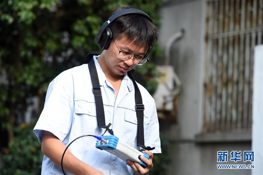 8月25日,在合肥市蜀山区邮电新村小区,听漏队队员张杨用听漏仪对供水管道进行漏水检测。 新华社记者 周牧 摄