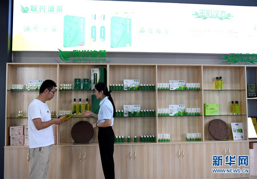 8月25日,在河南省光山县一家油茶加工企业展厅内,工作人员(右)向顾客介绍产品。 新华社记者 郝源 摄
