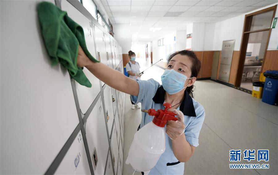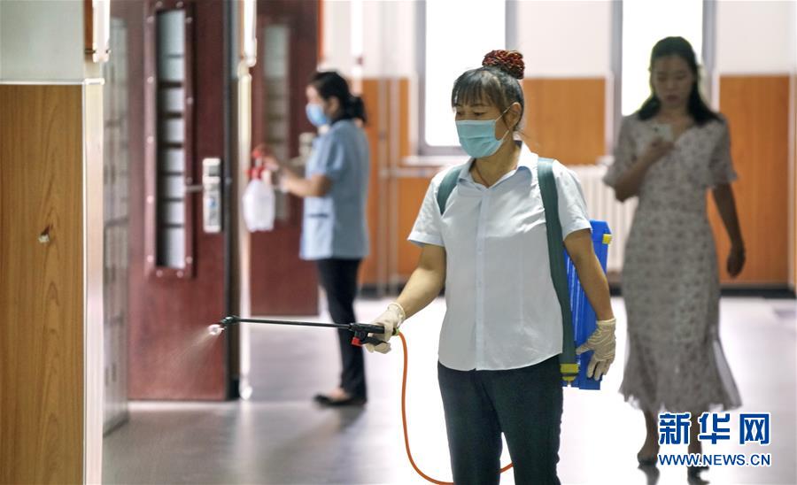 8月26日,北京市第十二中学钱学森学校的保洁人员在进行教学楼内的清洁和消毒。新华社记者 李欣 摄