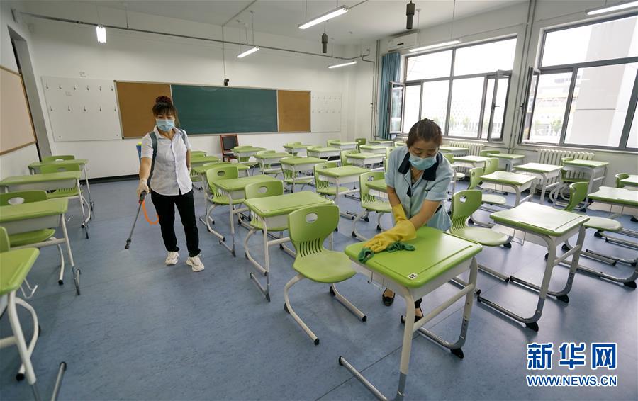8月26日,北京市第十二中学钱学森学校的保洁人员在对教室进行清洁和消毒。