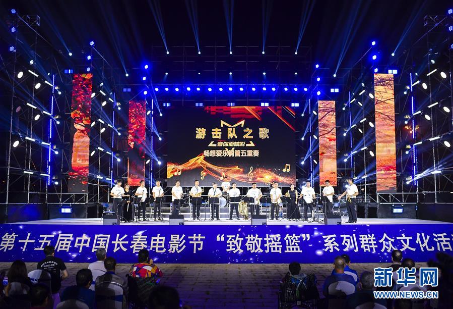 8月31日,在长春市文化广场举行的电影主题广场音乐会上,乐团演奏《游击队之歌》。 当日,作为第十五届中国长春电影节“致敬摇篮”系列群众文化活动之一的电影主题广场音乐会在长春市文化广场上演,乐团现场演奏了多首脍炙人口的经典电影插曲和配乐,为观众献上一场视听盛宴。 新华社记者 许畅 摄