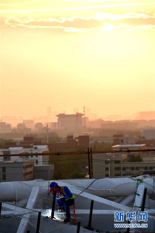 8月31日,在河南省郑州市郑东新区河南省科技馆新馆建设工地,工人在进行转接柱的焊接定位。 新华社记者 冯大鹏 摄