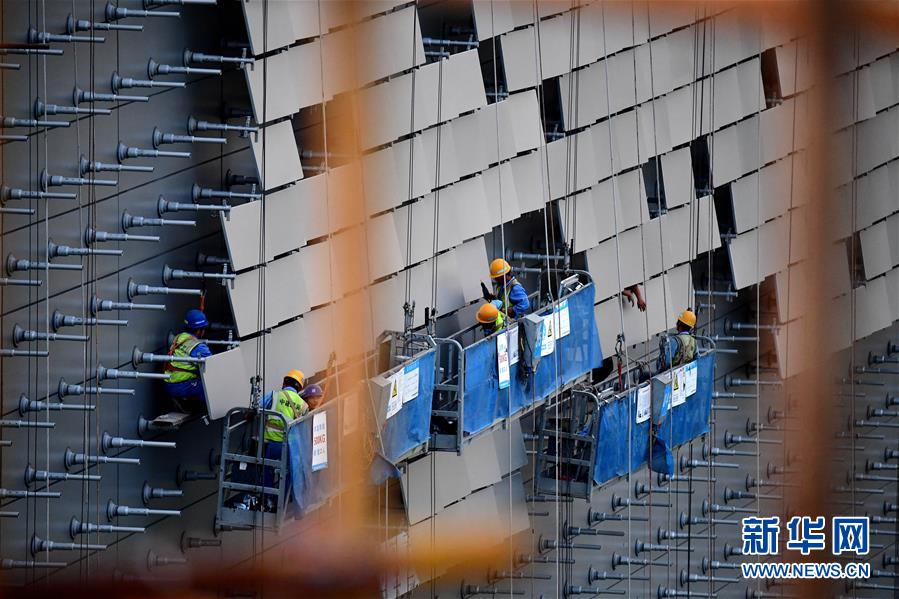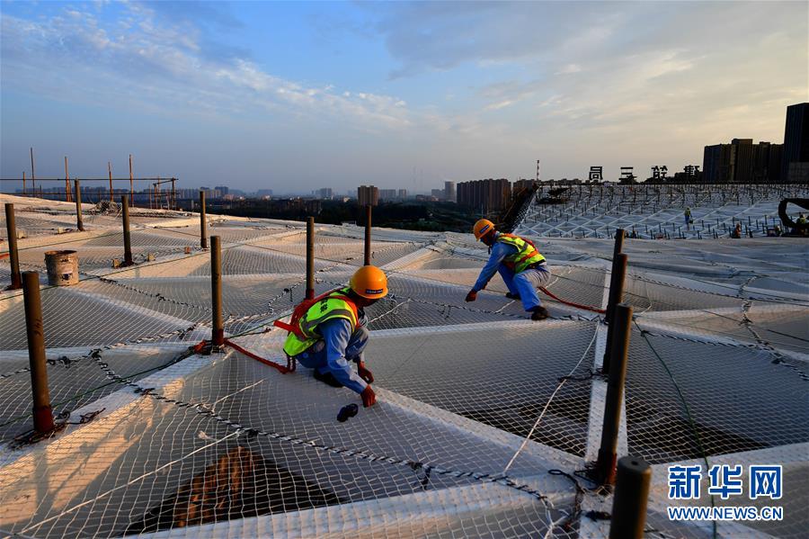 8月31日,工人在进行河南省科技馆新馆外侧幕墙安装。 新华社记者 冯大鹏 摄