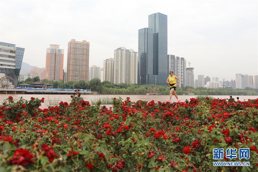 8月7日,一名市民在黄河兰州段北岸的兰州马拉松公园跑步锻炼。 新华社记者 多蕾 摄