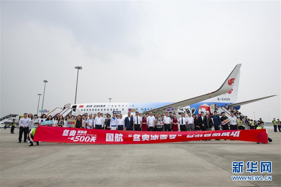 9月5日,在成都双流国际机场,“冬奥冰雪号”彩绘飞机机组成员与乘客落地后合影留念。 当日,从北京出发的北京2022年冬奥会和冬残奥会首架主题彩绘飞机“冬奥冰雪号”抵达成都完成首航。 新华社发(中国国际航空股份有限公司供图)