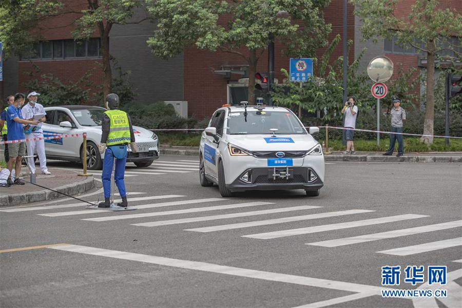 9月12日,一辆自动驾驶汽车在最强车脑挑战赛上挑战“行人横穿马路”的交通场景。新华社记者 黄伟 摄