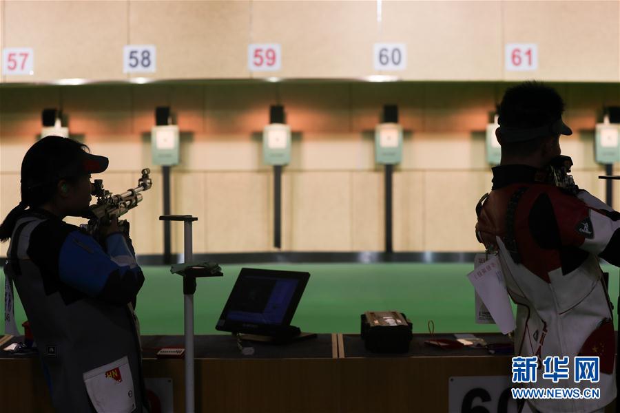 9月22日,国家集训队队员张彬彬(左)与队友赵中豪在10米气步枪混合团体资格赛中。 当日,2020年全国射击冠军赛步枪项目比赛在湖北省宜昌市奥体中心射击馆正式开赛。 新华社记者 丁汀 摄