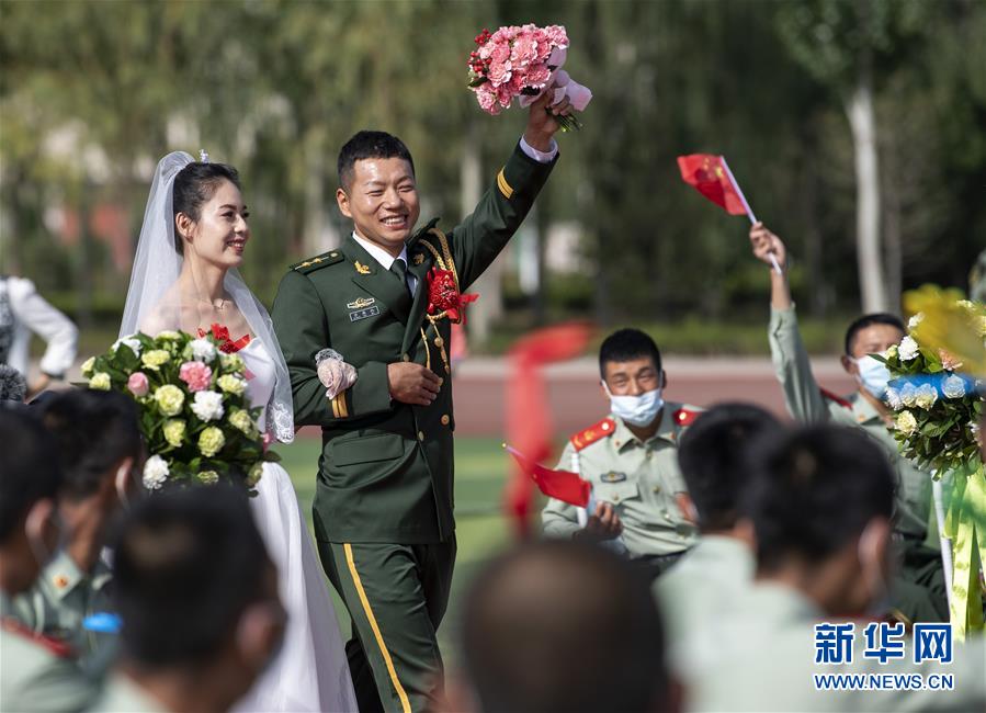 9月25日,新人步入集体婚礼现场。 当日,武警宁夏总队第二届“强军有你,真情相拥”集体婚礼在银川举行。在国庆和中秋佳节来临之际,20对新人在亲属和战友的祝福下步入婚姻殿堂。 新华社记者 冯开华 摄