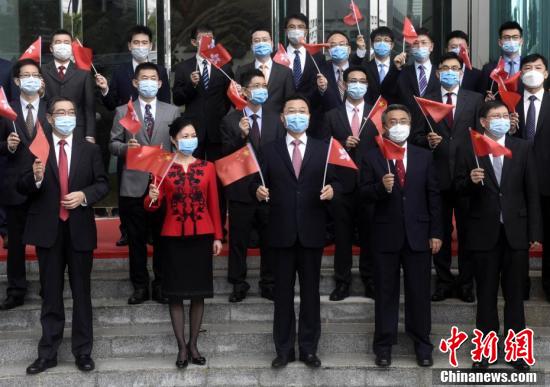 10月1日早上7时,外交部驻香港特派员公署为庆祝中华人民共和国成立七十一周年,举行国庆升旗仪式。图为外交部驻港公署特派员谢锋(前排中)及数十名工作人员出席。