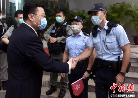 10月1日早上7时,外交部驻香港特派员公署为庆祝中华人民共和国成立七十一周年,举行国庆升旗仪式。图为外交部驻港公署特派员谢锋与在场警员握手。