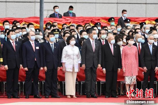 10月1日,香港特区政府在金紫荆广场举行国庆71周年升旗仪式。全国政协副主席董建华(右三)、全国政协副主席梁振英(右四)、香港特区行政长官林郑月娥(右二)、中央人民政府驻香港特别行政区联络办公室主任骆惠宁(左三)、中央人民政府驻香港特别行政区维护国家安全公署署长郑雁雄(左二)等嘉宾出席升旗仪式。