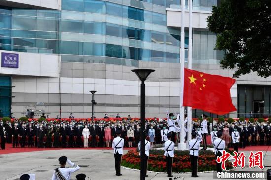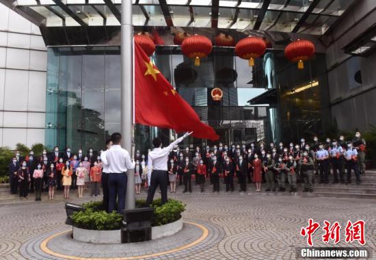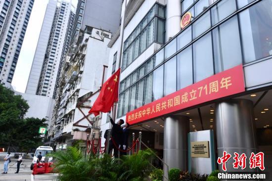 10月1日早上7时,外交部驻香港特派员公署为庆祝中华人民共和国成立七十一周年,举行国庆升旗仪式。中新社记者 邓庆乐 摄