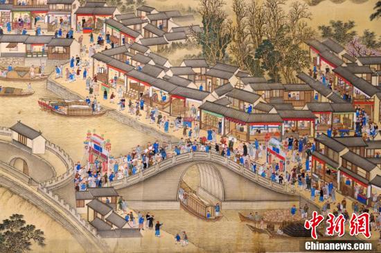 10月3日,清宫旧藏《康熙南巡图》第六卷散佚逾百年后首次在香港会展中心全卷合璧公开展出,吸引众多人士观赏。图为《康熙南巡图》第六卷局部。