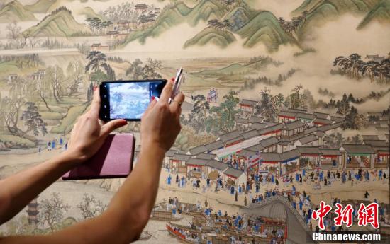 10月3日,清宫旧藏《康熙南巡图》第六卷散佚逾百年后首次在香港会展中心全卷合璧公开展出,吸引众多人士观赏。图为观众拍摄《康熙南巡图》第六卷局部。