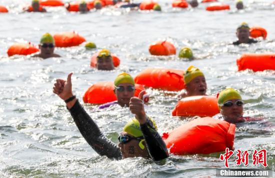 10月8日,一名方队里的队员向岸上的观众竖起大拇指致意。当日,2020武汉水上马拉松在武汉东湖风景区郭郑湖水域举行,30名运动员和600多名游泳爱好者参赛。比赛设置10公里竞技游和方队健康游。参赛者们劈波逐浪、畅游东湖,展示奋发向上、自强不息的精神。中新社记者 张畅 摄