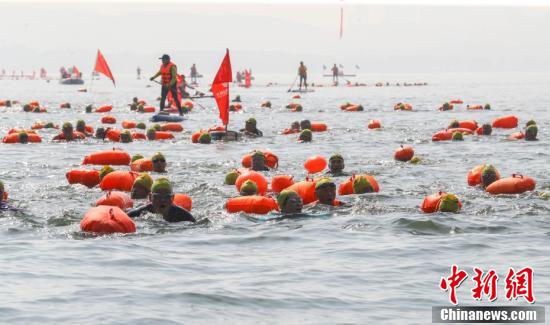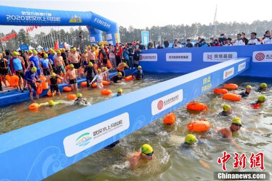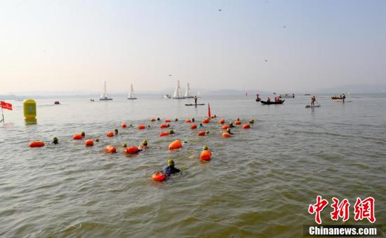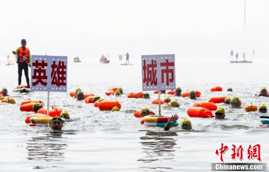10月8日,游泳爱好者组成的方队下水畅游东湖。当日,2020武汉水上马拉松在武汉东湖风景区郭郑湖水域举行,30名运动员和600多名游泳爱好者参赛。比赛设置10公里竞技游和方队健康游。参赛者们劈波逐浪、畅游东湖,展示奋发向上、自强不息的精神。中新社记者 张畅 摄