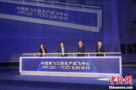 10月30日晚,中国商飞首次在其江西生产试飞中心交付ARJ21客机,这也是江西航空继“井冈山”号、“景德镇”号后,接收的第3架ARJ21客机。最新交付的“宜春”号ARJ21客机为90座全经济舱布局,延续了江西航空ARJ21客机“一机一城一文化”的主题客舱服务模式。图为江西省委常委、南昌市委书记吴晓军(右二)、江西省委常委、副省长吴忠琼(左一)、中国商飞党委书记、董事长贺东风(左二)、厦门航空有限公司副总经理汤建其(右一)共同推杆,为中国商飞江西生产试飞中心交付的首架ARJ21客机揭幕。