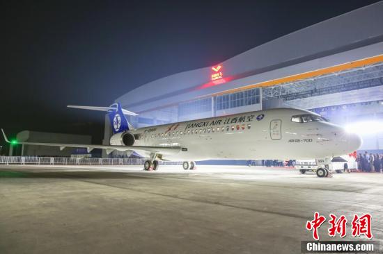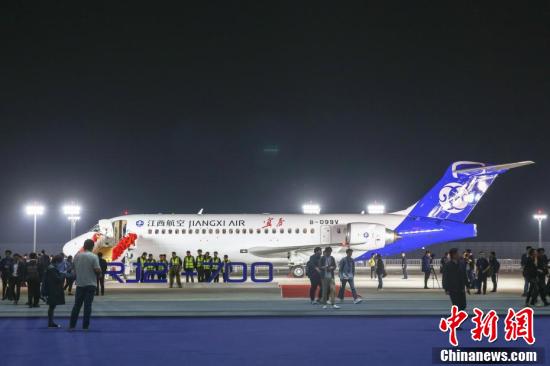 10月30日晚,中国商飞首次在其江西生产试飞中心交付ARJ21客机,这也是江西航空继“井冈山”号、“景德镇”号后,接收的第3架ARJ21客机。最新交付的“宜春”号ARJ21客机为90座全经济舱布局,延续了江西航空ARJ21客机“一机一城一文化”的主题客舱服务模式。中新社记者 刘力鑫 摄