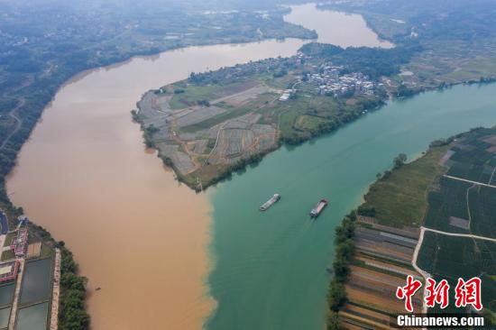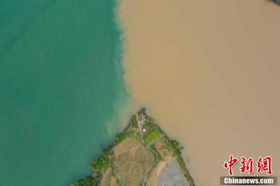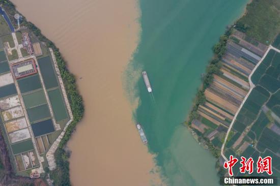 10月31日,航拍广西南宁三江口。三江口位于南宁市江南区江西镇宋村附近,为左江和右江的汇合点、邕江零公里处。近日,夹杂泥沙的左江呈现出黄色,与清澈的右江形成了独特的“鸳鸯江”景观。中新社记者 陈冠言 摄