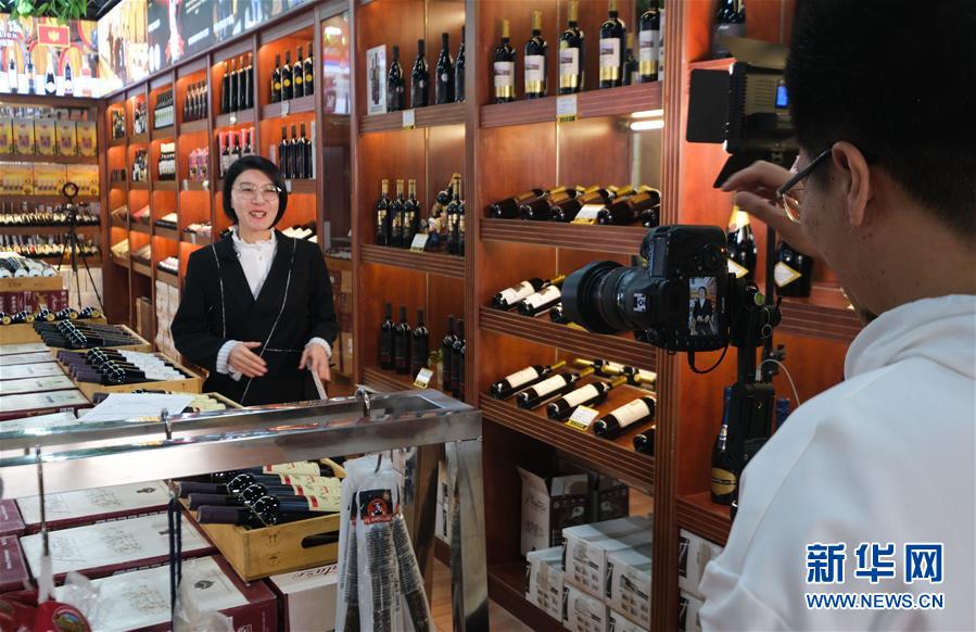 11月5日,青田进口商品城的进口红酒销售商录制视频准备在线上销售平台进行推广。 新华社记者 徐昱 摄