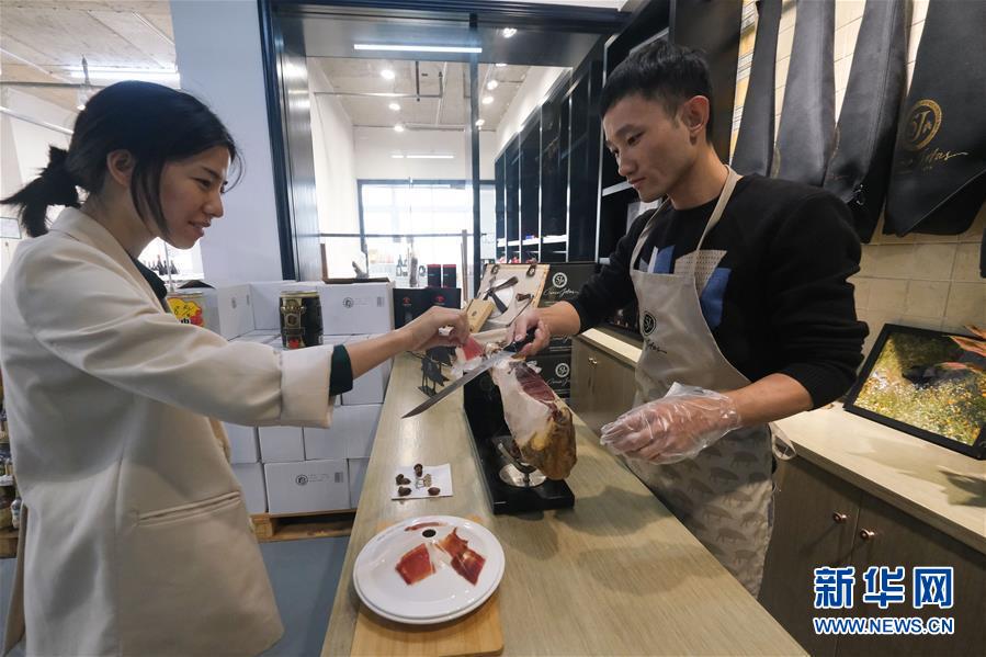 11月5日,顾客在青田一家进口商品超市内品尝一款西班牙进口火腿。