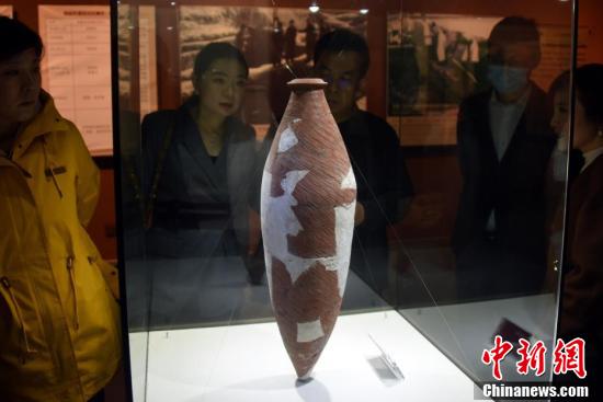 11月7日,仰韶文化博物馆展示的“镇馆之宝”小口尖底瓶。仰韶文化博物馆位于河南省三门峡市渑池县仰韶村遗址保护区,是中国国内首家仰韶文化专题博物馆。