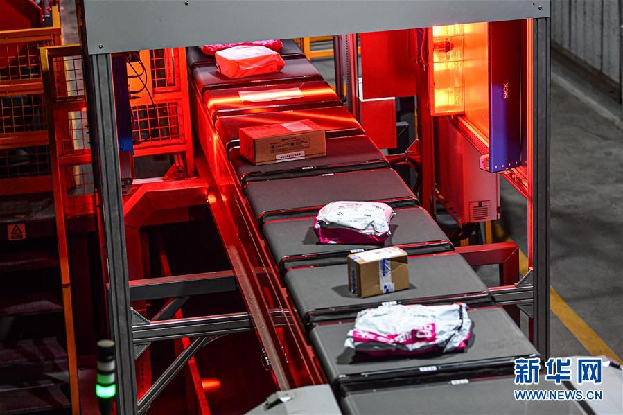 这是11月8日在顺丰速运海口美兰中转场拍摄的分拣设备扫描快递的场景。 临近“双十一”,位于海口的顺丰速运海口美兰中转场一片繁忙景象。工作人员借助分拣设备,抓紧时间分拣、打包快递,保障快递在“双十一”物流高峰期间正常流转。 新华社记者 蒲晓旭 摄