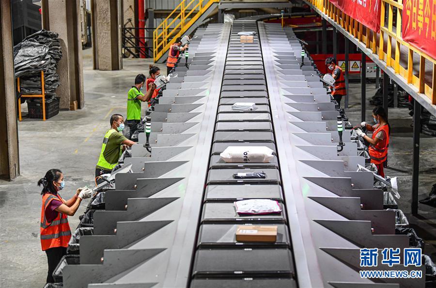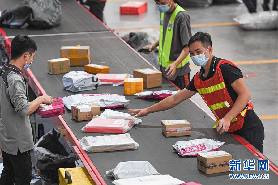 这是11月8日在顺丰速运海口美兰中转场拍摄的快递分拣、打包现场。 临近“双十一”,位于海口的顺丰速运海口美兰中转场一片繁忙景象。工作人员借助分拣设备,抓紧时间分拣、打包快递,保障快递在“双十一”物流高峰期间正常流转。 新华社记者 蒲晓旭 摄